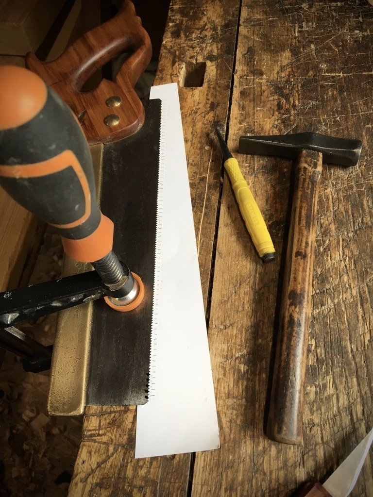 Pour ne pas se tromper de dent - à cette échelle c'est pas évident -, la lame bien à plat sur l'établi, posée sur une feuille de papier un peu épaisse, je fais une marque toutes les deux dents. Avec le chasse-clou et un petit marteau on frappe très légèrement une dent sur deux puis on pivote la feuille de 180° et on la décale d'une dent tout en changeant de face de la scie. Ceci permet de se retrouver avec la même répartition des dents sur la deuxième face, en effet l'écartement des dents n'est pas tout à fait le même entre la pointe et le côté manche, quelquefois c'est même voulu. Puis tout l'art consiste à frapper très doucement avec toujours la même force, un très petit marteau est conseillé.