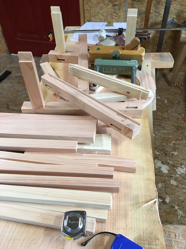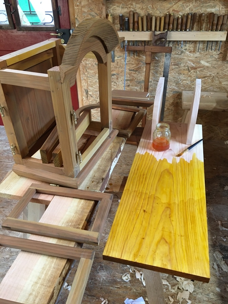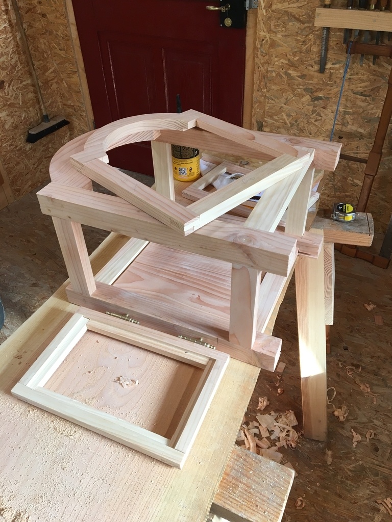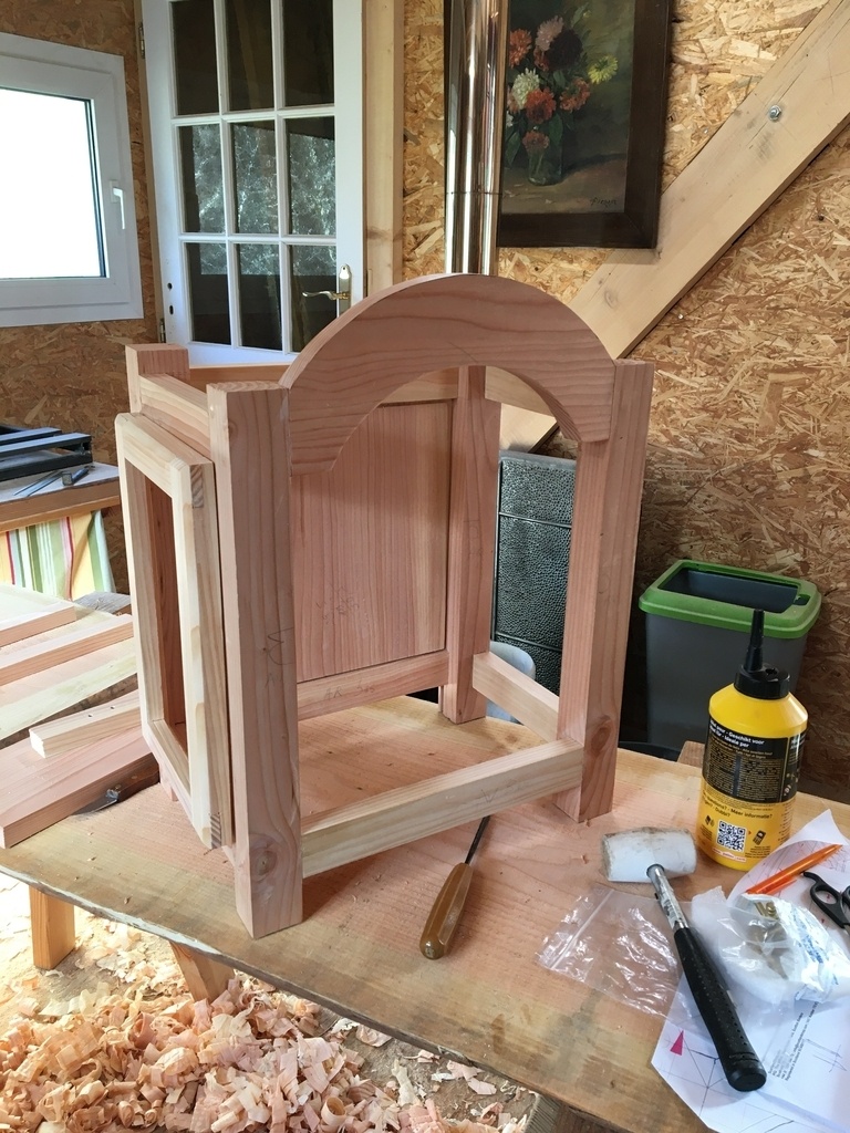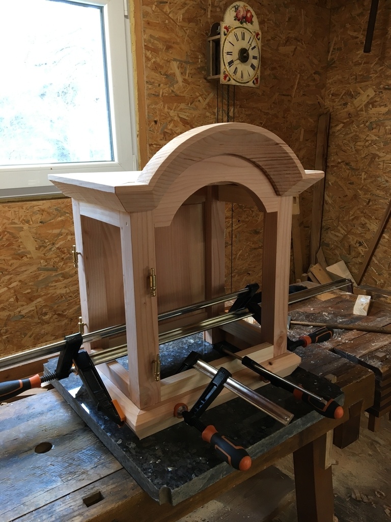 Achetée en brocante il y a trente ans, cette vénérable « forêt noire » vieille de plus de deux siècles traînait au grenier. J’ai entrepris de lui construire un écrin. Le seul bois sec et suffisant dont je disposais étant du Douglas, mon plan se devait de ne pas comporter trop de moulures ou de sculptures, je me suis inspiré de notre art populaire alsacien. Ça commence au grenier de mon atelier pour le choix des bois, puis c’est découpes, corroyage, mortaises, rainures.