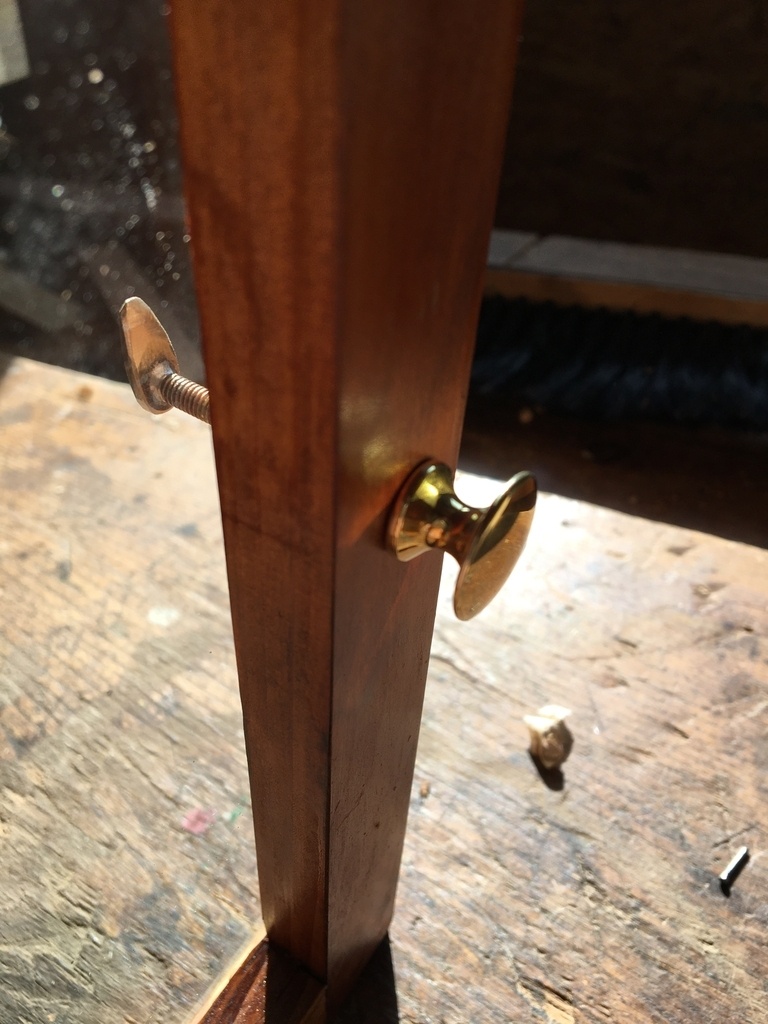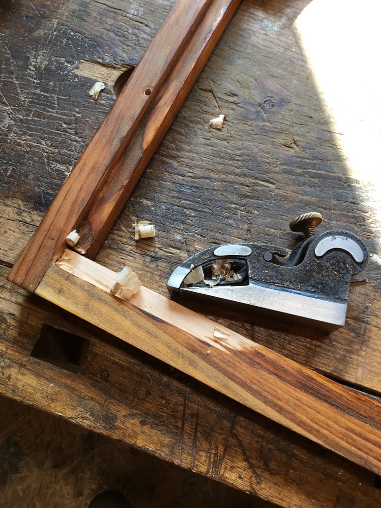 Façonnage du support, le Stanley 8 est bien utile. Puis collage et enfin teinte, bichromate, huile de lin et gomme laque. Finition au petit bullnose avant pose des verres. Réalisation de petits loquets en laiton, les poids sont des tubes laiton dans lesquels j’ai coulé du plomb. Toute la quincaillerie laiton à été acquise sur le net pour une cinquantaine d’euros.