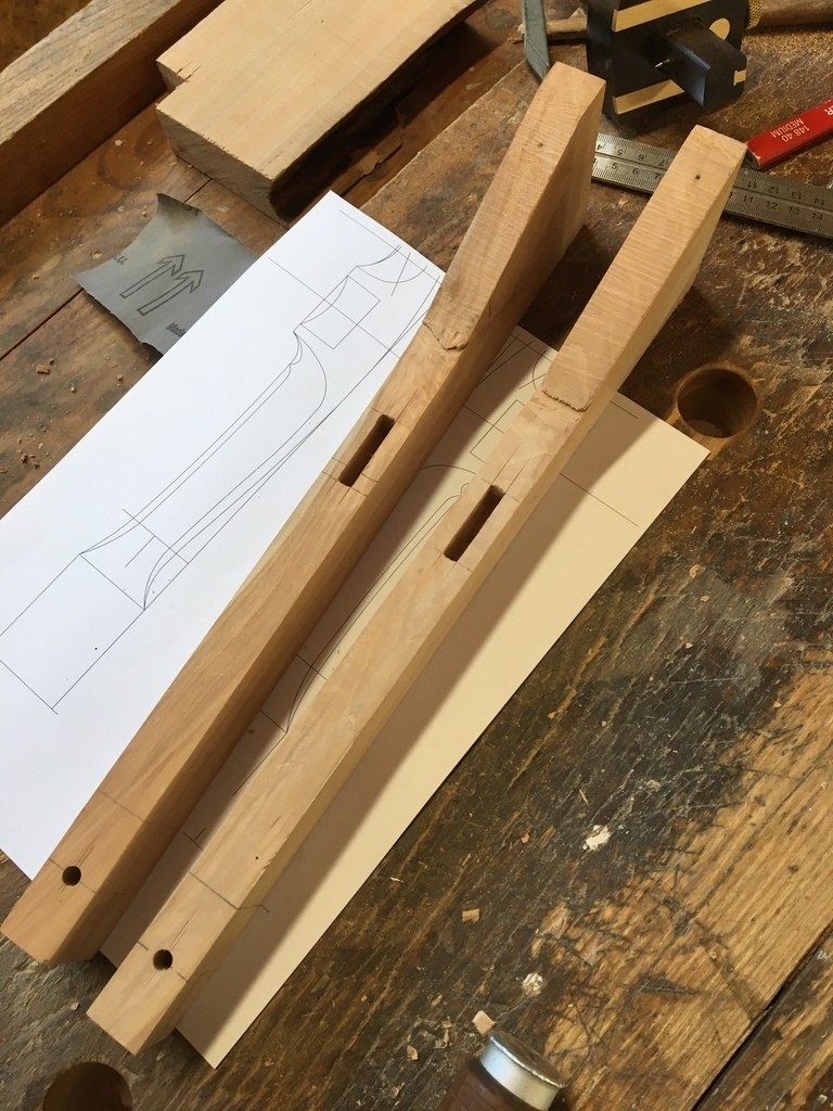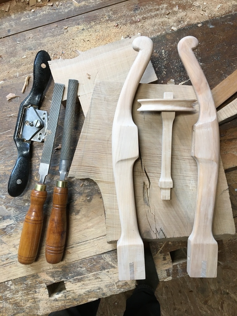 Ça commence par le choix du bois, j’ai opté pour du poirier et du prunier pour les poignées. C’est dur, homogène et esthétique ce qui ne gâte rien. Les fibres doivent suivre la courbure des bras pour la solidité.