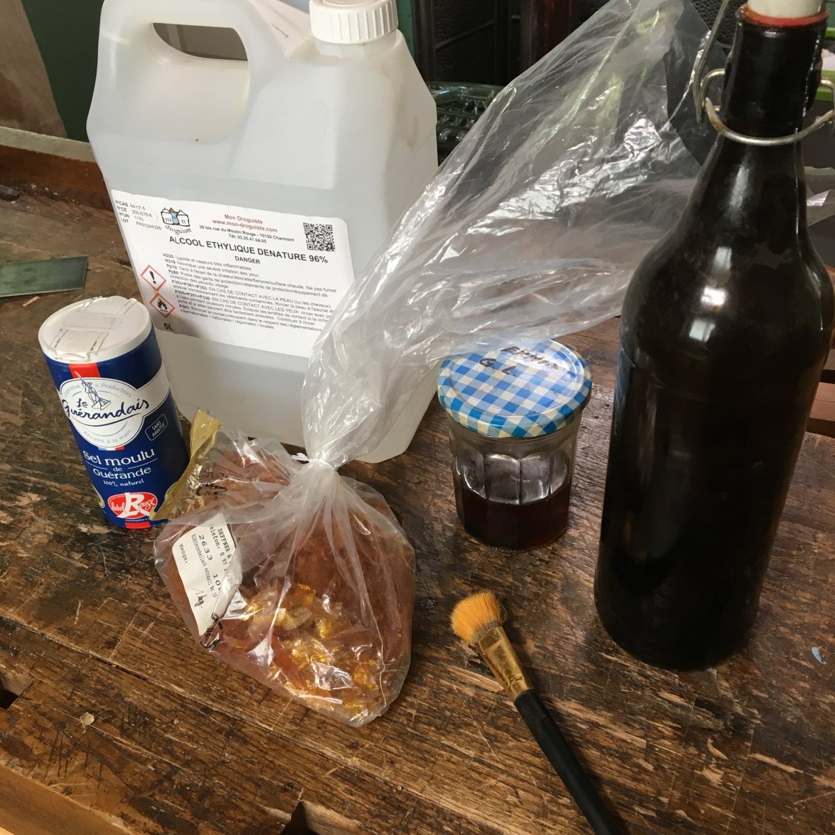 La gomme laque en paillettes ça vaut 30/35 € les 500 gr, avec ça on a largement de quoi s'amuser un bon moment. Pour préparer le vernis j'utilise un bocal à stériliser d'un litre avec son joint en caoutchouc. On verse 1 litre d'alcool à 95° sur 150 à 200 gr de paillettes. On remue très souvent sinon ça forme une masse gélatineuse qui mettra très longtemps à se dissoudre, mais elle finira quand même par fondre.