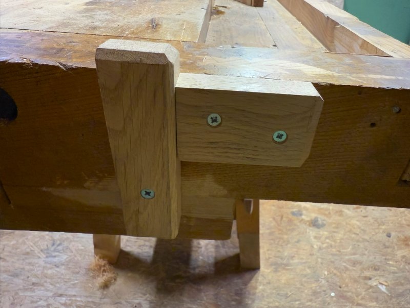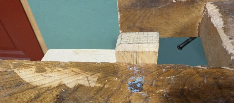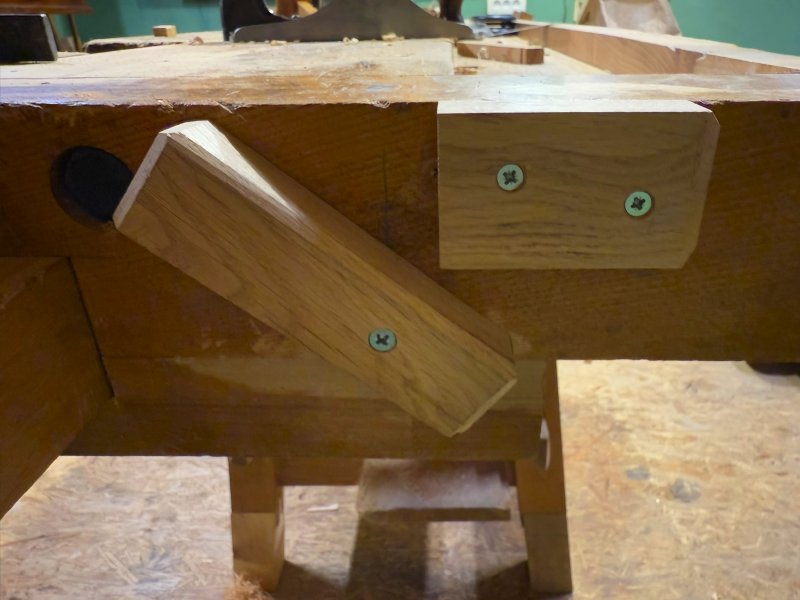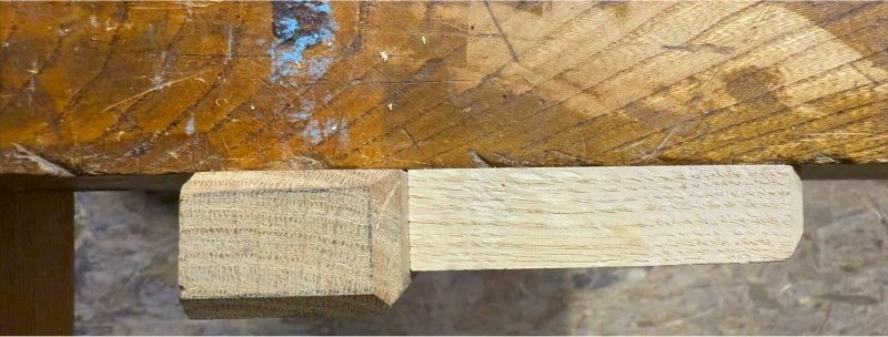 Ci dessous mes valets d'établi, j'en ai plusieurs qui dépassent plus ou moins de l'établi, une petite entaille à hauteur de plateau évite que se crée un biais qui soulève la pièce maintenue.